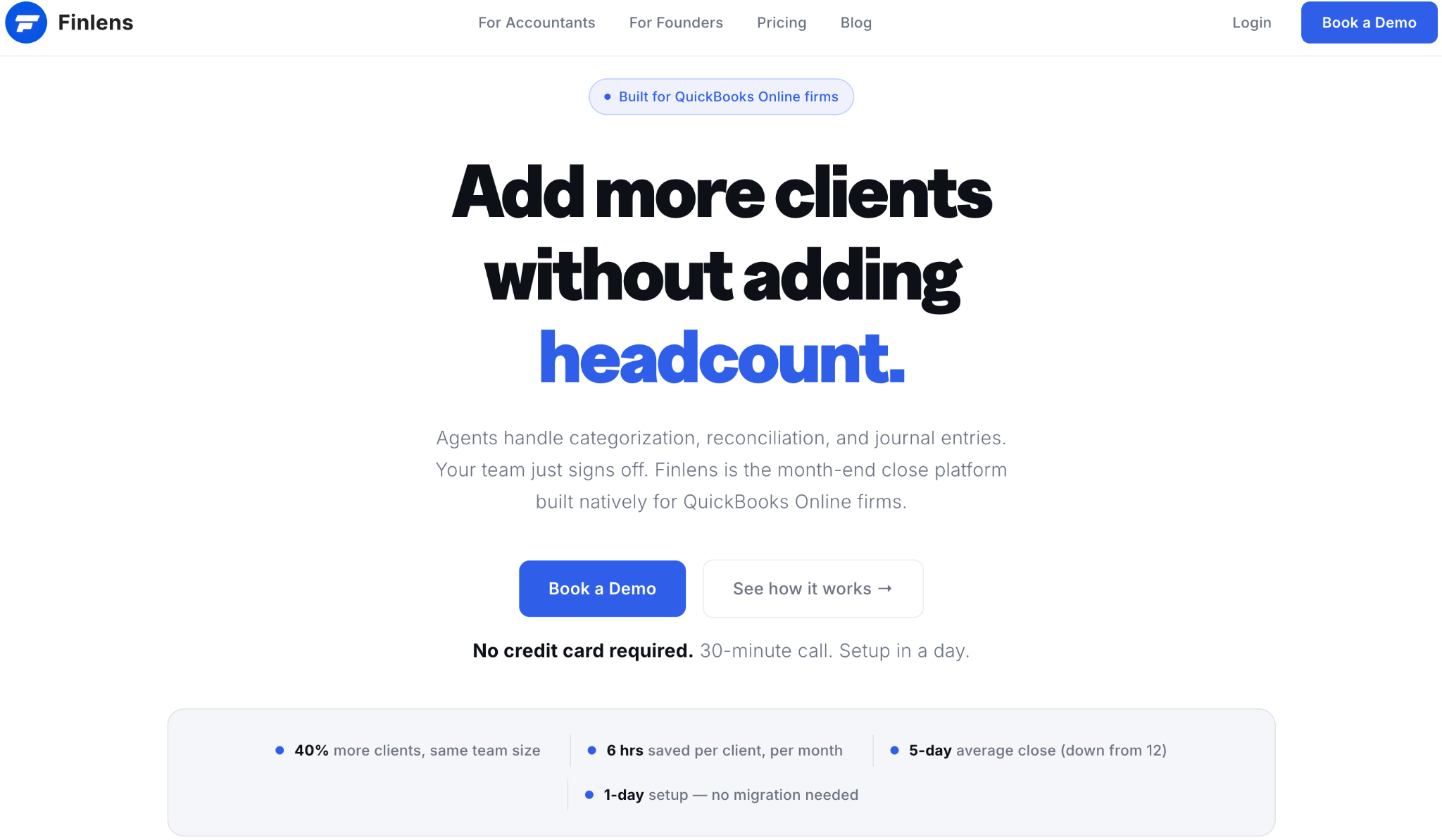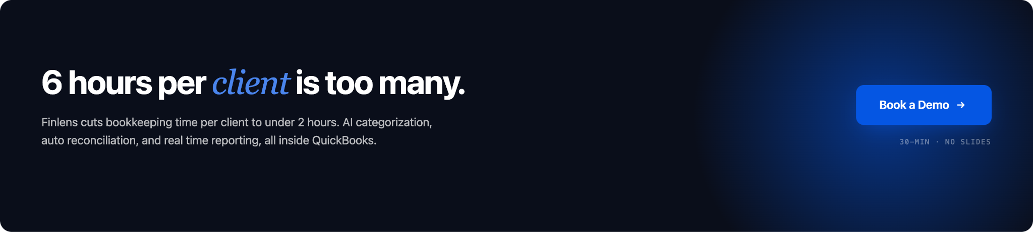 The accountant's take: Finlens answers a question other tools on this list don't: "How do I make QuickBooks do more of work for me without ripping it out and starting over?" If your bottleneck is categorization, reconciliation, and month-end close time, and your clients are already on QBO, this targets that exact problem. The claim is that one bookkeeper can manage 300+ businesses with AI-powered automation. At $30 per client per month flat, ROI math is simple: if it saves you 4+ hours per client, it pays for itself several times over.