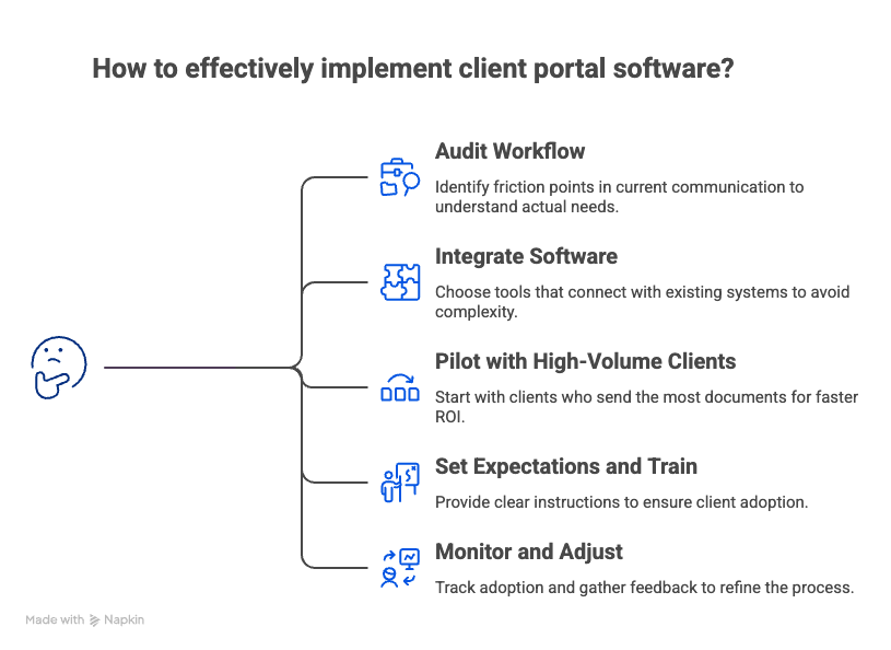 Pilot the portal with clients who send the most documents or ask the most questions. High-volume relationships are where you'll see the fastest ROI—and where you'll learn what works before rolling out firm-wide.
