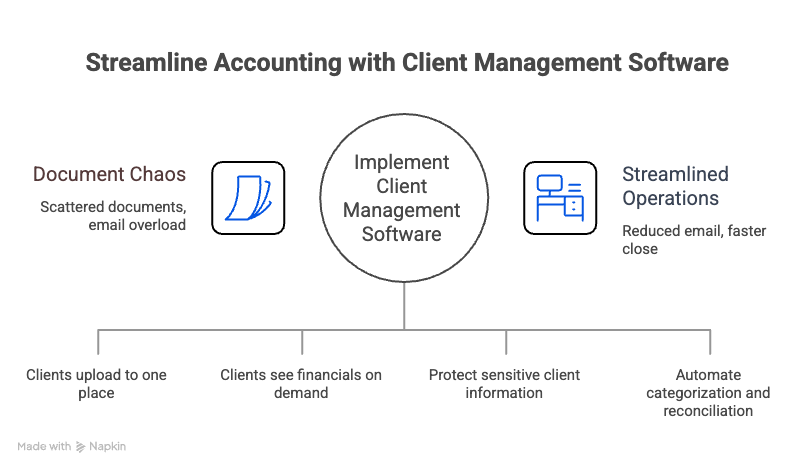 A centralized portal replaces this chaos. Clients upload to one place. You see what's in and what's outstanding. The back-and-forth shrinks dramatically.