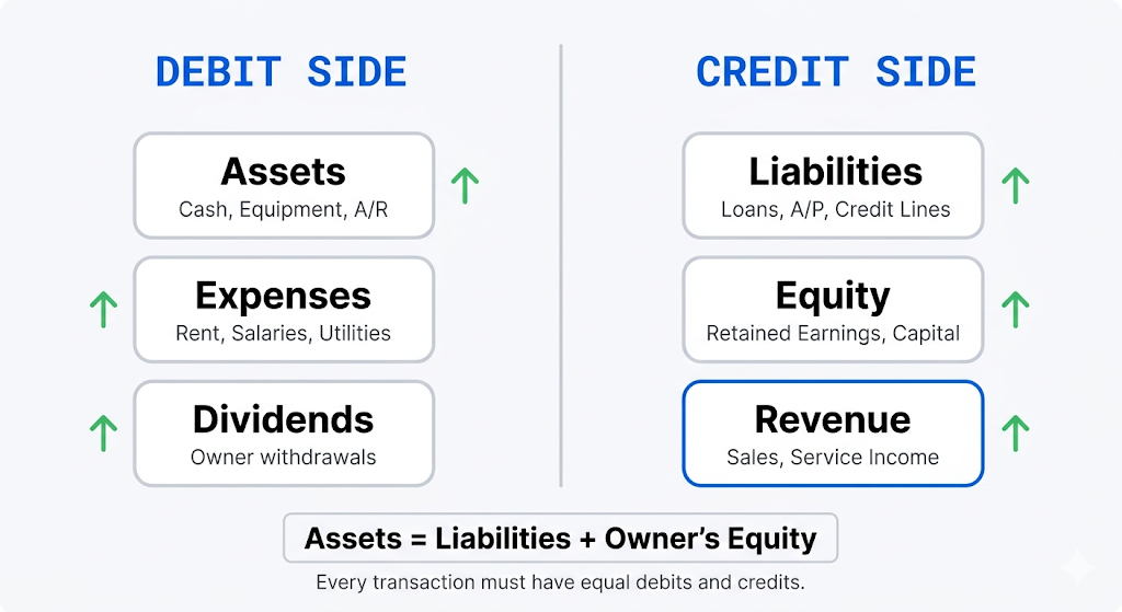 Here is logic broken down simply. When a business earns money, two things happen at once. An asset grows (cash comes in or a receivable is created), and equity grows (business is now worth more). The asset increase is a debit. The equity increase, through revenue, is a credit. Both sides stay balanced.