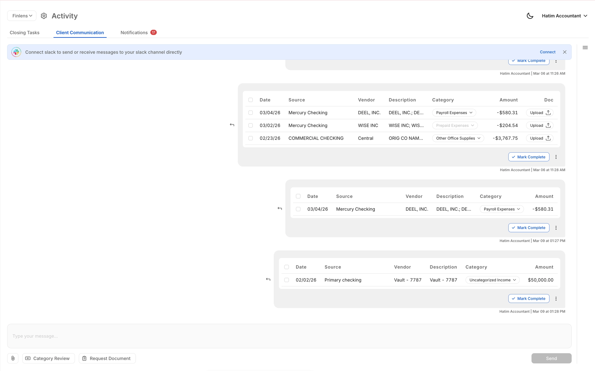 In-platform document requests and category reviews replace email back-and-forth. Clients respond via email, Slack, or in-app — keeping close on schedule without chasing anyone.